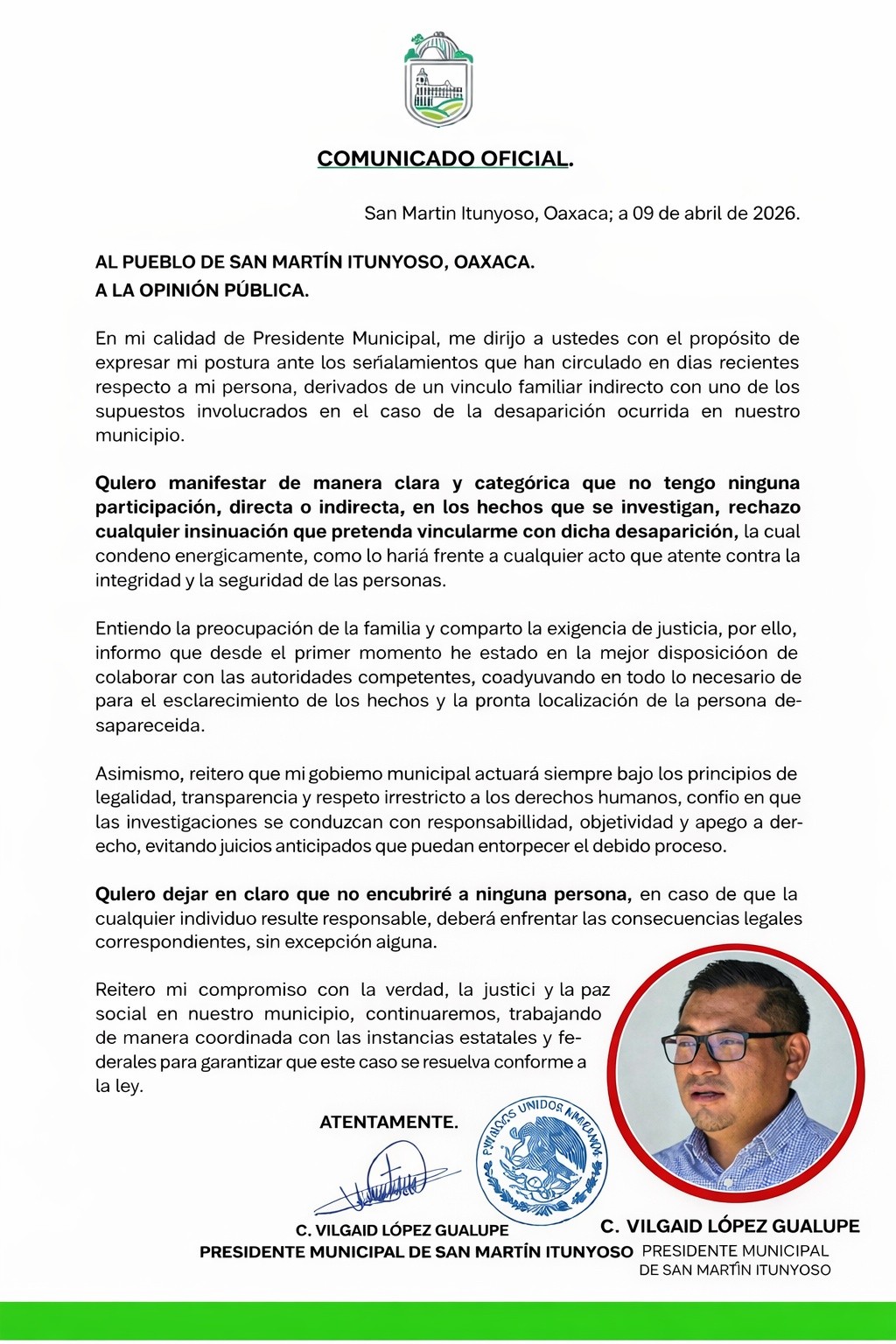 Read moreAL PUEBLO DE SAN MARTÍN ITUNYOSO, OAXACAA LA OPINIÓN PÚBLICAEn mi calidad de Presidente Municipal, me dirijo a ustedes con el propósito de expresar mi postura ante los señalamientos que…